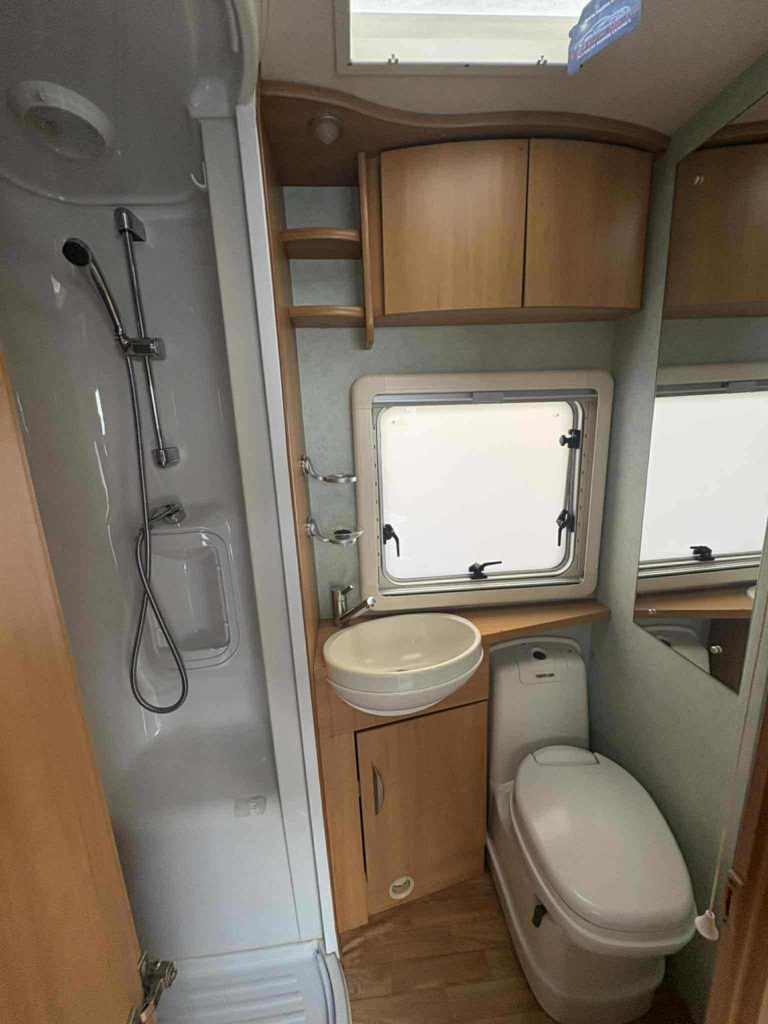 - Opposite washroom with sink, mirror, and fixed cassette toilet.